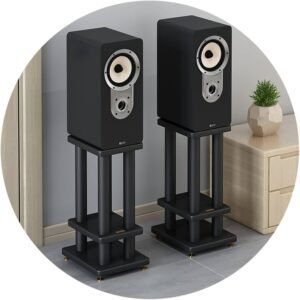 تستخدم حوامل معدنية وأذرع دوارة لتثبيت السماعات بدقة على الجدران أو الأسقف.